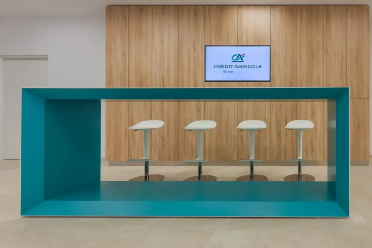 Astfel sunt propuse pentru fabricația mobilerului cu specific bancar noul material compozit acrilic intrat pe piața românesca, Avonite Surfaces® pentru blaturile de lucru ale recepției și mobilierul media, mdf vopsit extramat super coat cu textură catifelată, mobilierul de office în turcoazul Credit Agricole și o fibră de lemn luminoasă, care să aducă un plus de căldură spațiului pentru dulapurile de depozitare făcute la comandă pe toată înălțimea pereților. „Pornind de la motto-ul băncii Credit Agricole, <Banca pentru tine>, s-a încercat realizarea unui concept care să transforme o imagine rece și corporatistă într-o imagine caldă cu o atmosferă primitoare, o atmosferă în care clienții să se simtă confortabil.