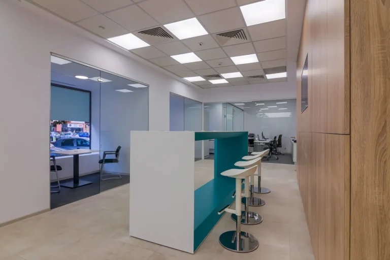 Mobilier bancar din Avonite și mdf vopsit. Concept nou de mobilier office pentru Credit Agricole.