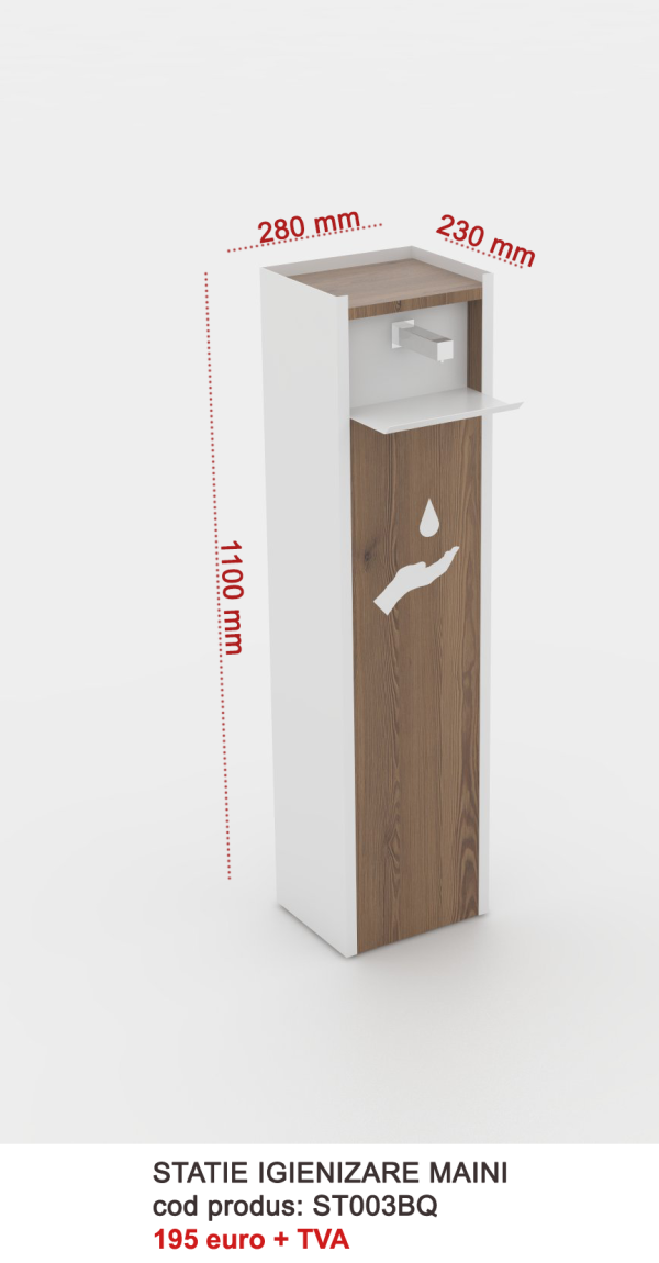 Statie dezinfectare maini cod produs ST003BQ fabricat din otel vopsit in camp electrostatic fin texturat culoare alb ral 9003 si melamina stejar LARICE DE MUNTE gri pentru curatare usoara, picioruse de reglaj pentru pardoseli cu denivelari, toate colturile rotunjite pentru prevenirea accidentarilor. Dimensiuni de gabarit 1100 x 280 x 230 mm (inaltime x latime x adancime). Destinat spatiilor publice cu trafic intens cum ar fii hiper-marketuri, mall-uri, cladiri de birouri si institutii publice, aceasta statie de dezinfectie poate fi echipata cu dozatoare de mare capacitate cu rezervor de gel dezinfectant de 6 litrii dar si cu dispensere simple de 1 litru. Prevazut cu usa de acces in sistem push to open pentru reumplere rezervor.