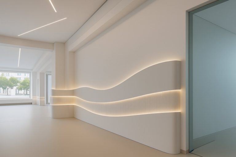 Într-un cadru luminos, curat și elegant, formele fluide și lumina indirectă construiesc o atmosferă de calm și profesionalism. Liniile dinamice ale pereților și plafonului transmit senzația de mișcare controlată, ghidând privirea și mișcarea vizitatorului într-un mod firesc.